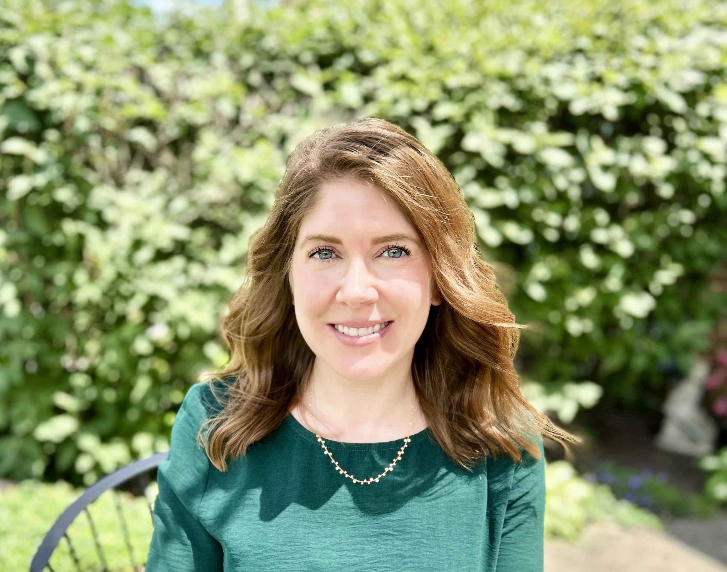 Lindsay Major, founder of Green cardinal. A woman with shoulder-length light brown hair and blue eyes, smiling, sitting outdoors in front of greenery.